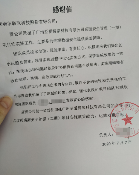 对于广州至爱智家科技有限公司发来的感谢信,联软科技感到十分的荣幸,并感谢相关部门同事在此次项目实施过程当中给予的各方面支持。联软也期待加强双方合作,为至爱智家后续的服务献策献力,以实现双方共赢。