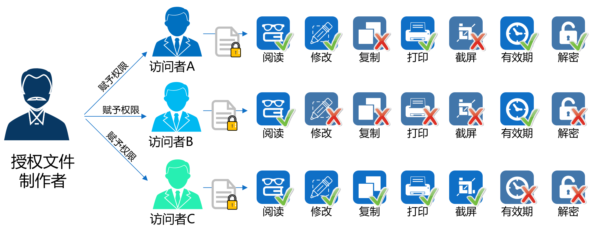 授权文件的制作者可以自主设置文档权限,限制查看者的读、写、复制、打印、截屏、有效期、解密权限,使加密文件的内容处于可控范围。