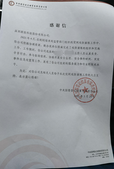 中央国债登记结算有限责任公司(简称“中央结算公司”)成立于1996年12月,职能定位于国家金融基础设施,是唯一一家由国务院批准并出资设立、专门从事金融基础设施服务的中央金融企业。注册资本50亿元,在国内同类机构中最为雄厚。联软科技依靠多年的经验和技术积累为此次的网络安全攻防演练行动提供全面服务,帮助中央结算公司演练和组织工作,在整个进程中我司工程师表现出来的深厚专业技能、良好的服务能力,受到客户赞誉。