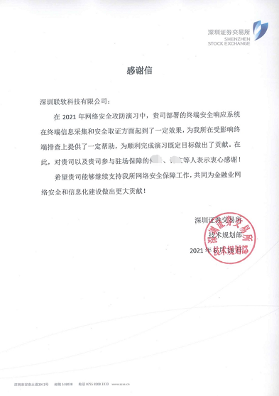 对于此次收到多位客户的感谢信,联软科技感到十分荣幸,并感谢各企业在演练行动中的大力支持和帮助。目前,联软的安全产品已在国信证券、中国银河证券、陆金所、易方达基金、国家开发银行、建设银行、民生银行等金融行业客户中广泛应用。联软已经服务了超70%的金融证券客户,金融行业终端保护平台市场占有率领先。
