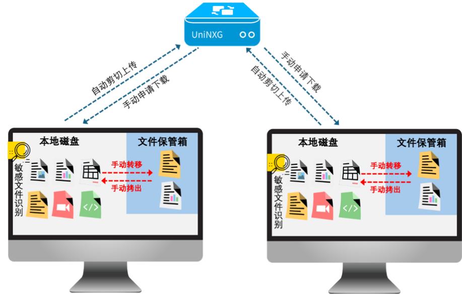 数据隔离防护:敏感文件在终端使用留存期间,可将文件存放在文件保险箱,文件保险箱与本地盘符隔离,可杜绝勒索病毒窃取和加密文件;同时文件保险箱可设置个人打开密码和隐藏机制,实现文件安全隔离和加密存储。